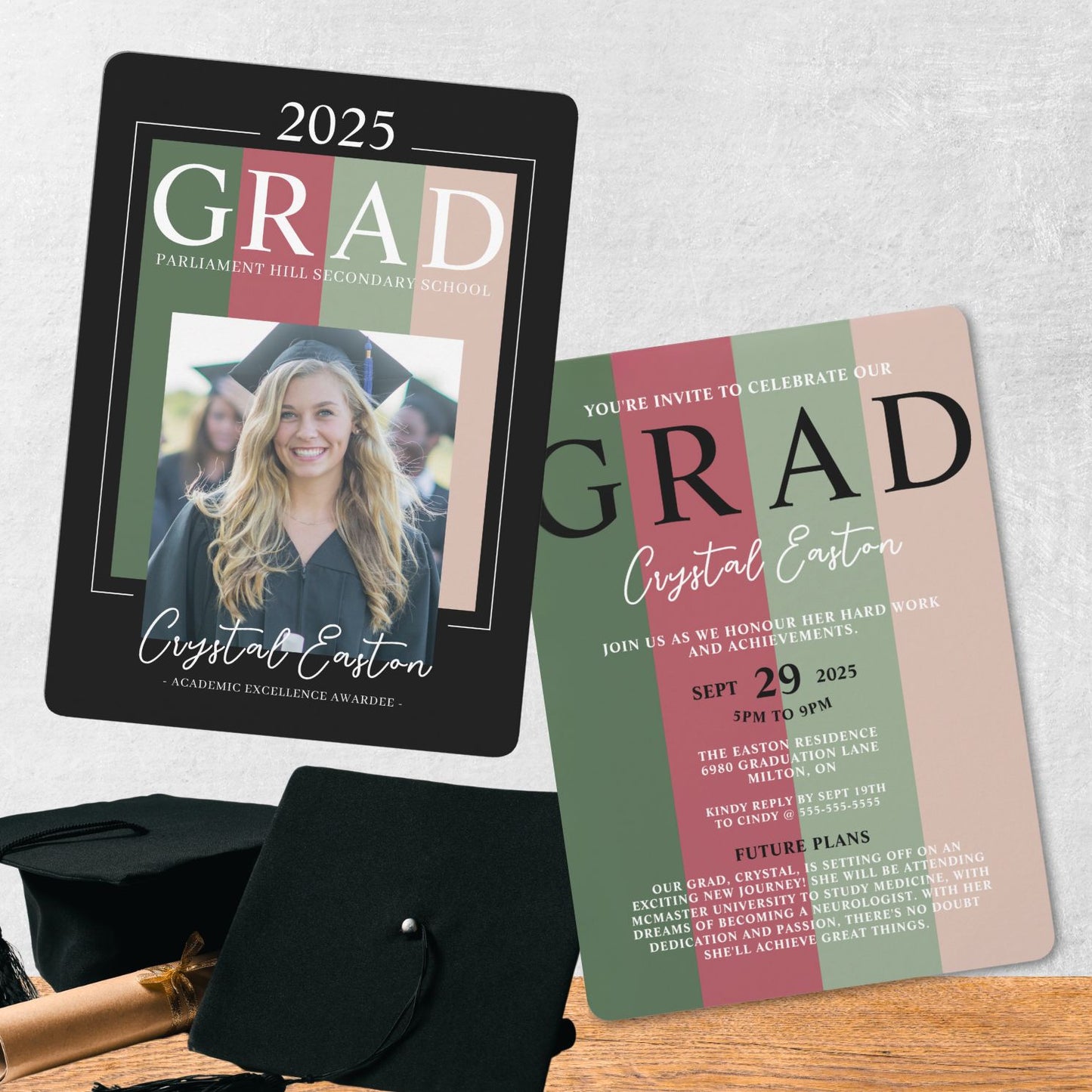 Celebrate your grads achievement with this modern and sophisticated graduation invitation. Featuring a photo of the graduate, this design highlights their success with elegance. The warm tones of four rich colors in the background provide a contemporary and stylish vibe, while the black backdrop grounds the design, adding depth and contrast. On the back, you'll find the essential party details along with a heartfelt note about the graduate’s exciting future plans. Perfect for anyone looking to add a personal touch to their celebration!