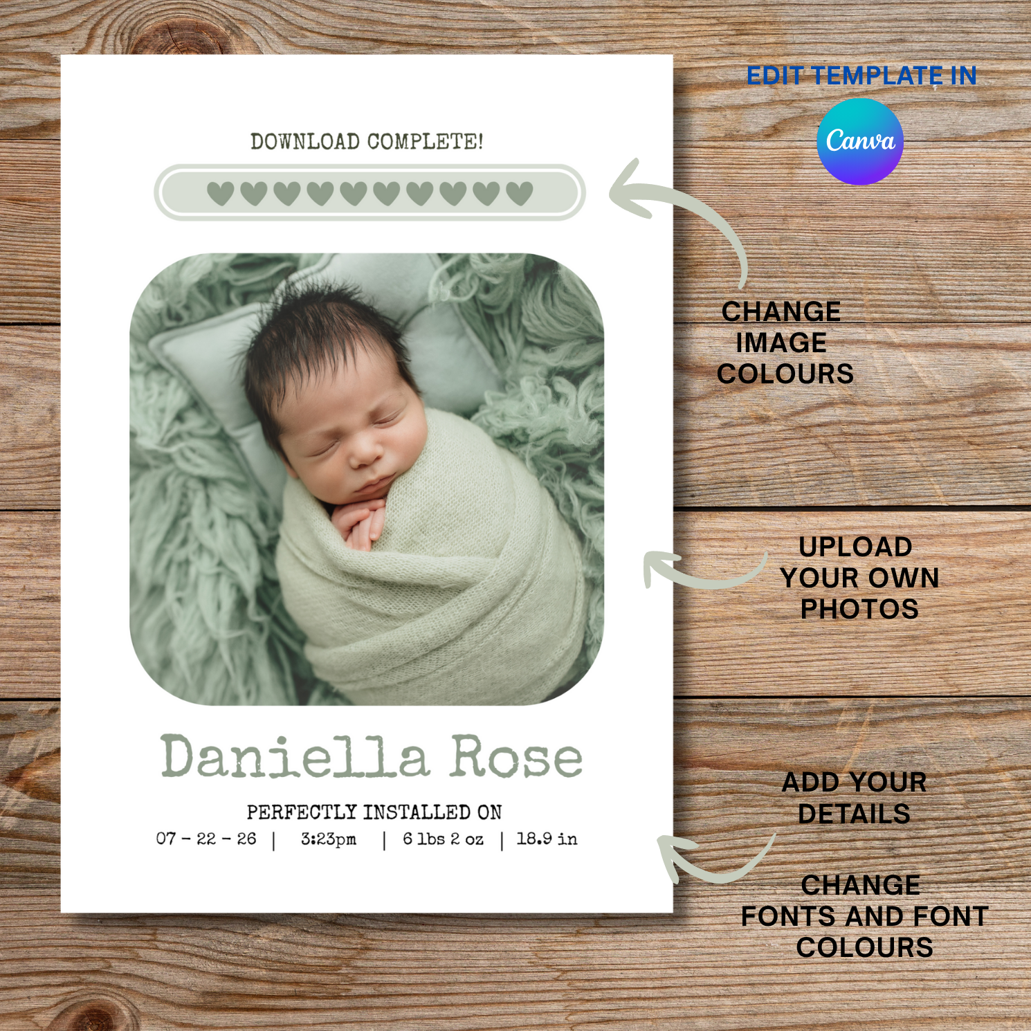 A full loading bar filled with hearts, symbolizing the completed journey of your precious bundle. An adorable baby photo with key details perfectly "installed" — including date, time of birth, weight, and length. The back continues the charming design with the parents' names and customizable job titles, such as Lead Programmer and Creative Director, adding a playful, personal touch.