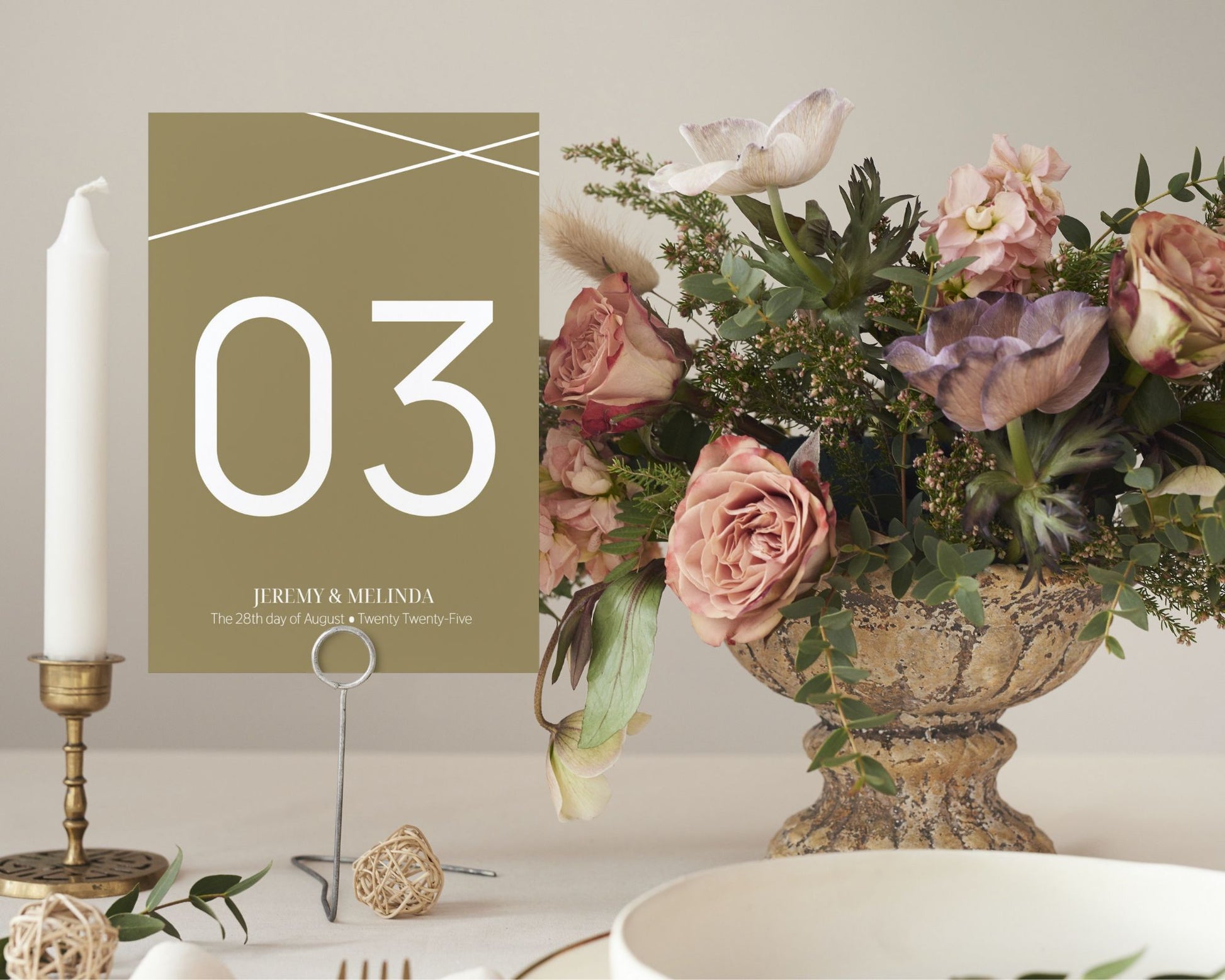 This editable digital wedding invitation set allows you to add your own photos, use your own QR Code, change background colour, and more. It features a simple, modern guest information card with a day of timeline, a photo thank you card and matching table numbers.