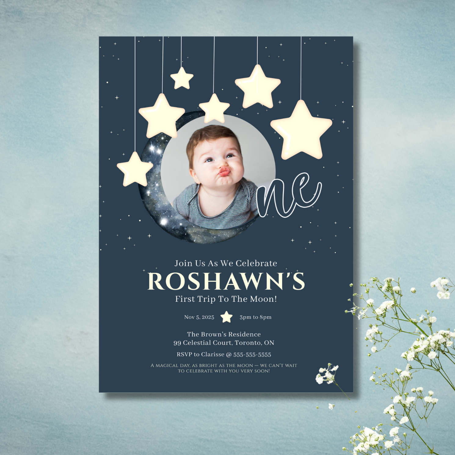 Celebrate your little star’s first trip around the moon with this enchanting invitation! Featuring a dreamy night sky, twinkling stars, and a glowing moon, this celestial-themed design creates the perfect atmosphere for a magical first birthday celebration. Personalize it with your child’s photo and event details to make a keepsake that’s truly out of this world. Perfect for a moonlit birthday adventure. Make your little one’s big day shine bright with an invitation that’s as sweet and cosmic as they are!