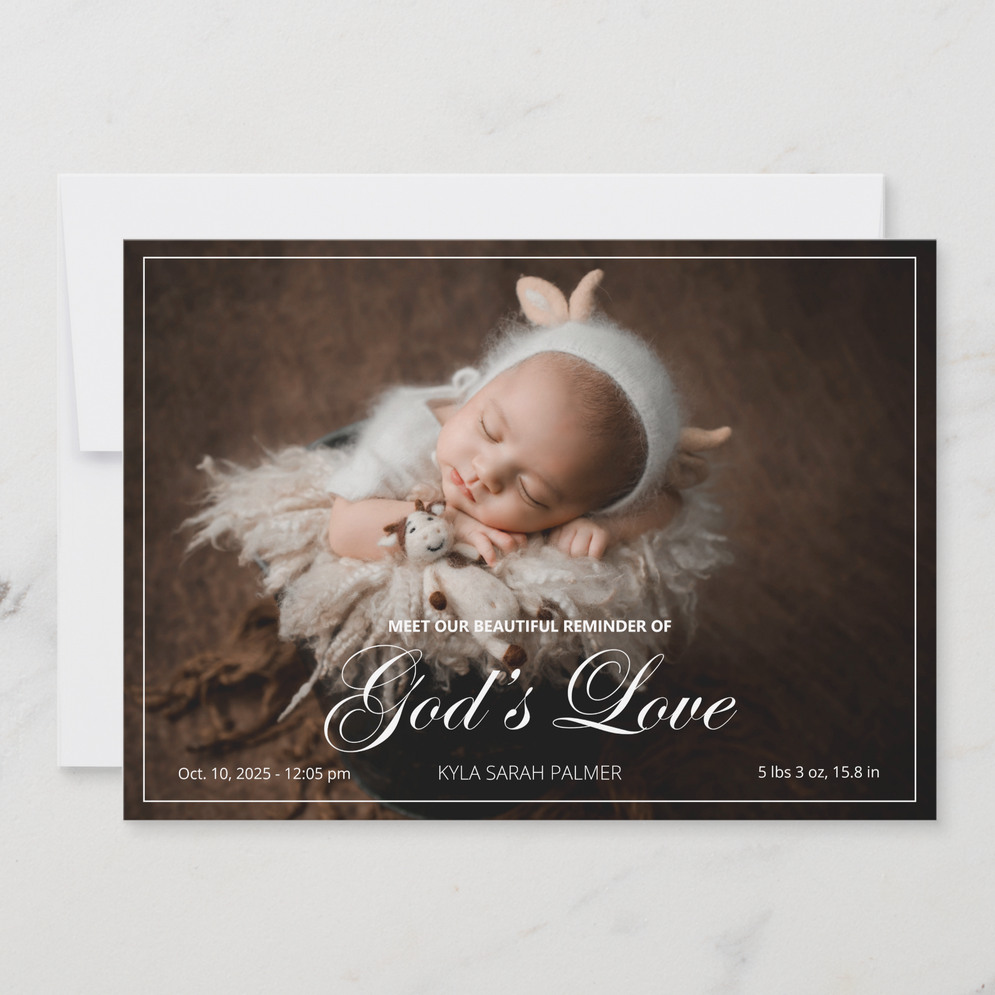 - For professional printing, this invitation is also available on Zazzle. Visit: God's Love Birth Photo Announcement Card | Zazzle (Please note, some design elements may differ on this platform.)