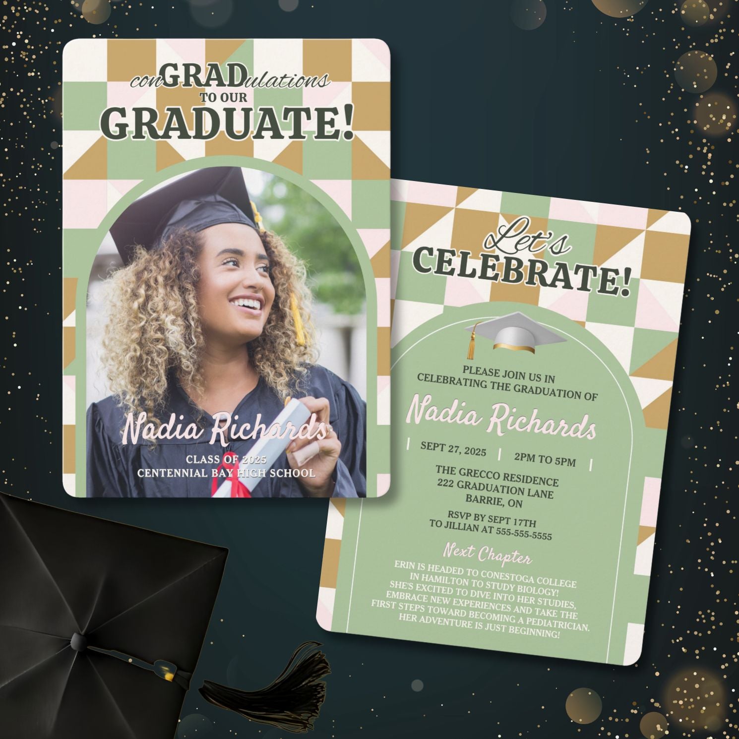Celebrate your grad in style with this modern and unique invitation! Featuring a contemporary geometric pattern in green, pale pink, and golden brown, this design brings a fresh and elegant touch. The front showcases a personalized photo of the graduate in an arched frame, making them the star of the moment. On the back, you'll find all the event details, along with a special section to share the graduate’s next exciting chapter. Perfect for a celebration as special as their achievement!