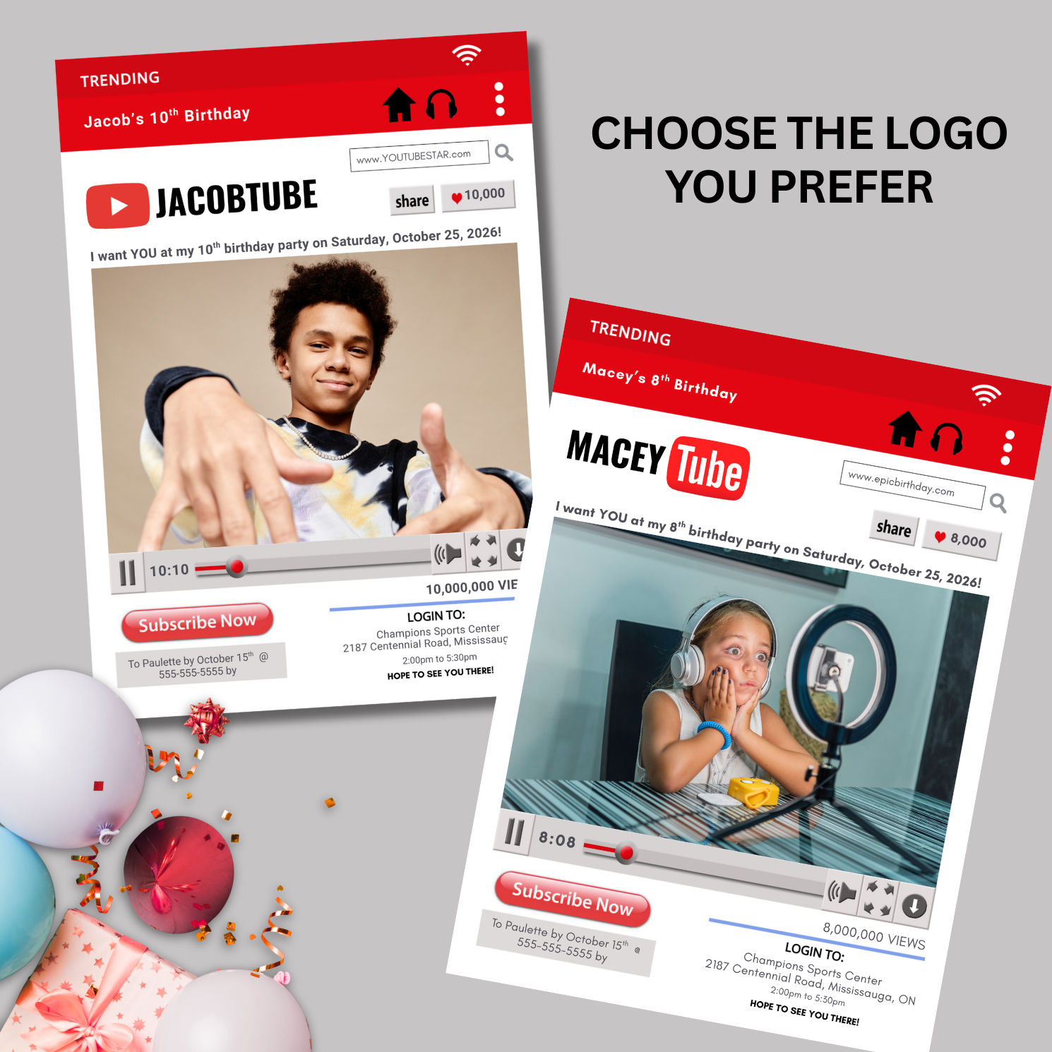 This invitation highlights your child's photo prominently in this trendy YouTube inspired birthday party invite. You can effortlessly insert your child's picture and personalize all the details, creating a fantastic customized invitation that your child will be excited to share.