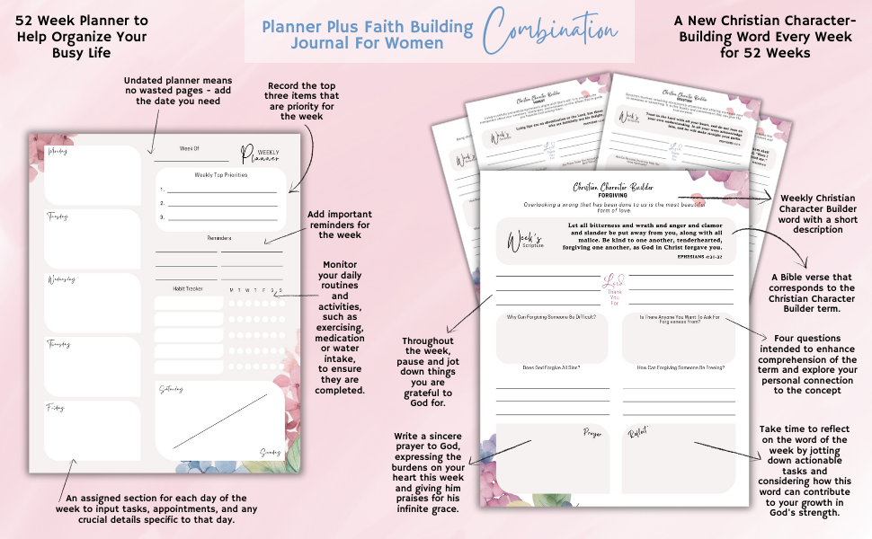 Organize your life and shape your identity as a resilient Christian woman with this comprehensive 52-week planner and prayer journal. Each week features a Christian Character Building Word paired with a relevant scripture and thought-provoking questions to help deepen your understanding. You'll find spaces to pen your personal prayers and reflect on the week's theme. The weekly planner section, which is undated, includes distinct areas for daily tasks, habit tracking, a to-do list, and a priority triage. Additionally, it contains dedicated pages for notes, passwords, and contacts to support organization.