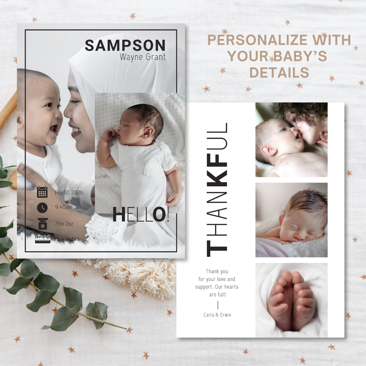 The back design offers three additional photo slots for capturing more sweet memories or family moments. The word "THANKFUL" adds a heartfelt touch, with space for a short, personalized thank-you message to express your gratitude to friends and family. Crafted with clean lines and minimalist elegance, this ultra-modern announcement is perfect for parents who love contemporary design and timeless sentiment. Share your joy in style!