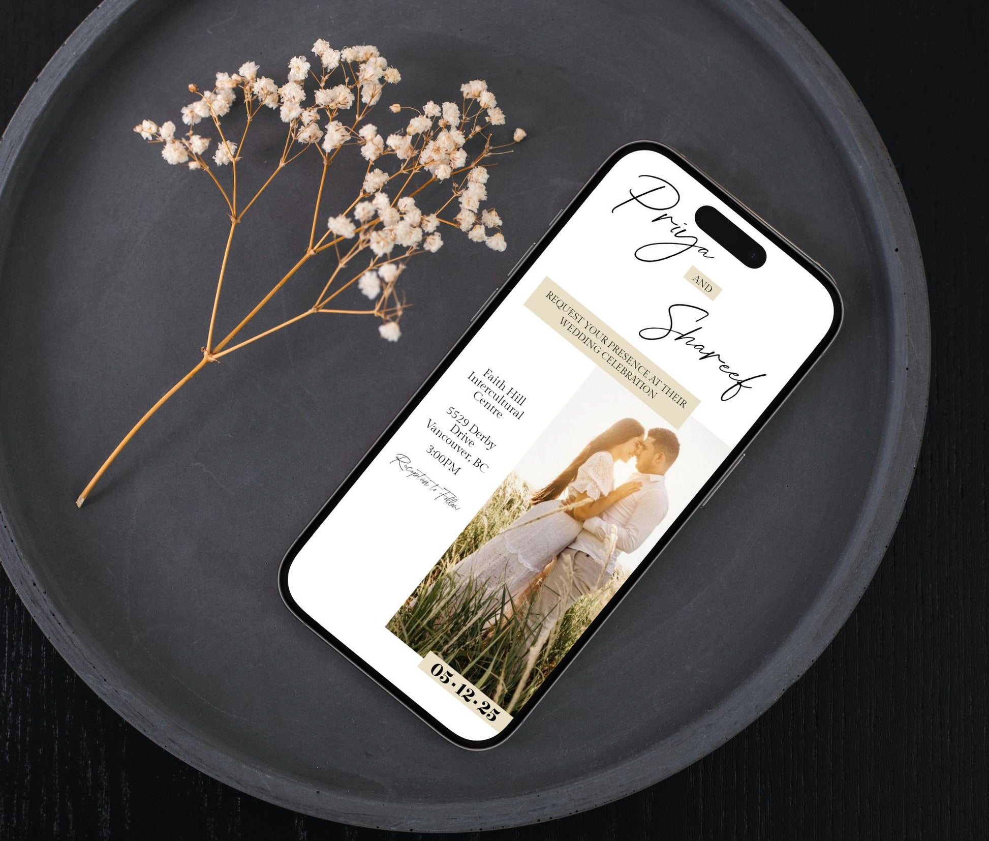 If you are looking for a contemporary wedding, anniversary or special occasion invitation set, consider this beautiful, modern set that can be personalized with your photo(s). This set includes a mobile invitation template, details card, rsvp card, and thank you card.