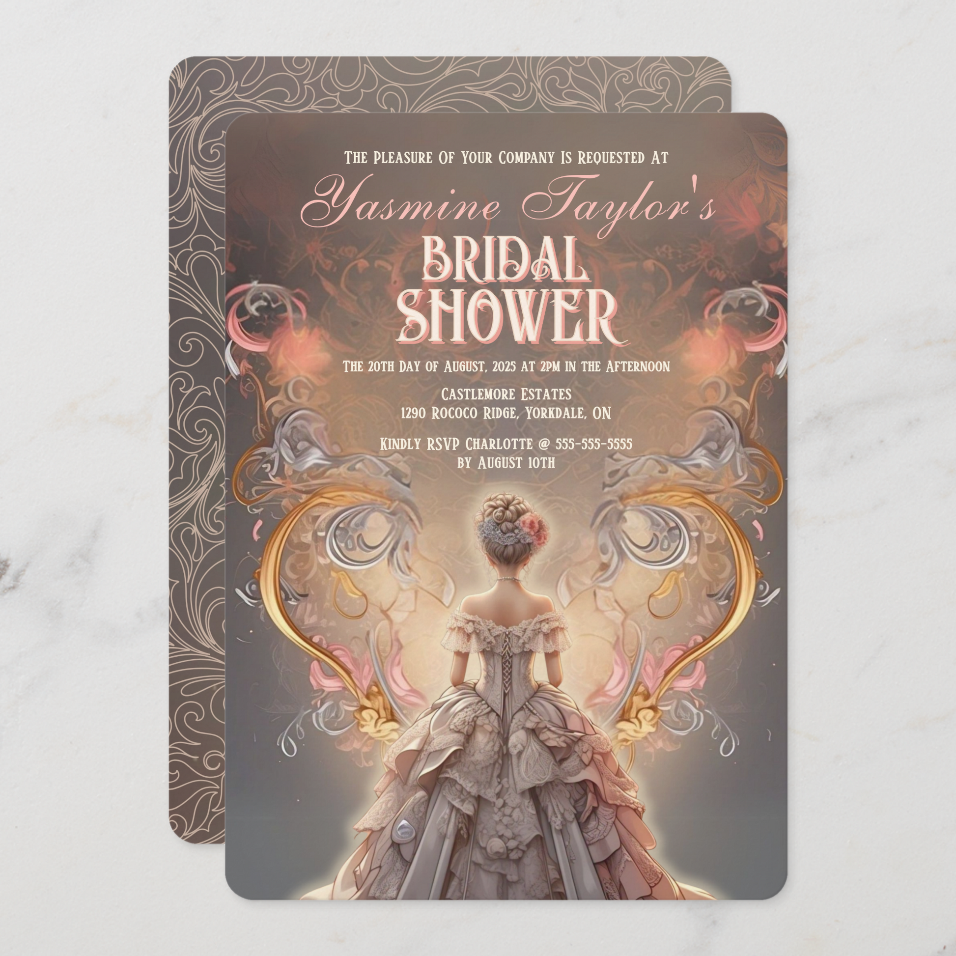This invitation features a stunning illustration of a graceful bride in an ethereal gown, framed by delicate flourishes and intricate Rococo-inspired motifs. Hints of soft pinks, gold accents, and rich, dark tan browns create a warm, luxurious palette that evokes the beauty of a bygone era.