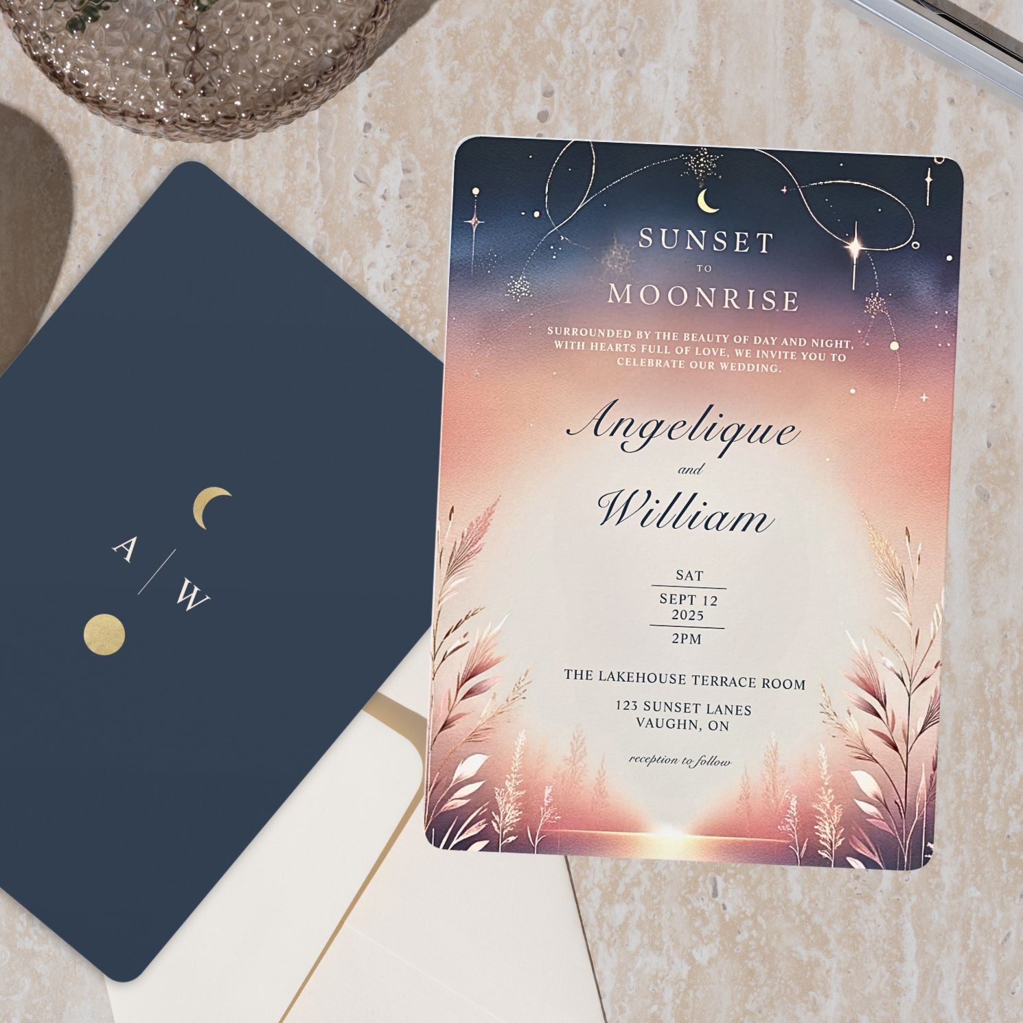 The back showcases the couple’s first initials alongside a gold crescent moon and sun, symbolizing unity and eternity. Perfect for romantic, celestial, or evening weddings, this invitation sets the tone for an unforgettable celebration under the stars.