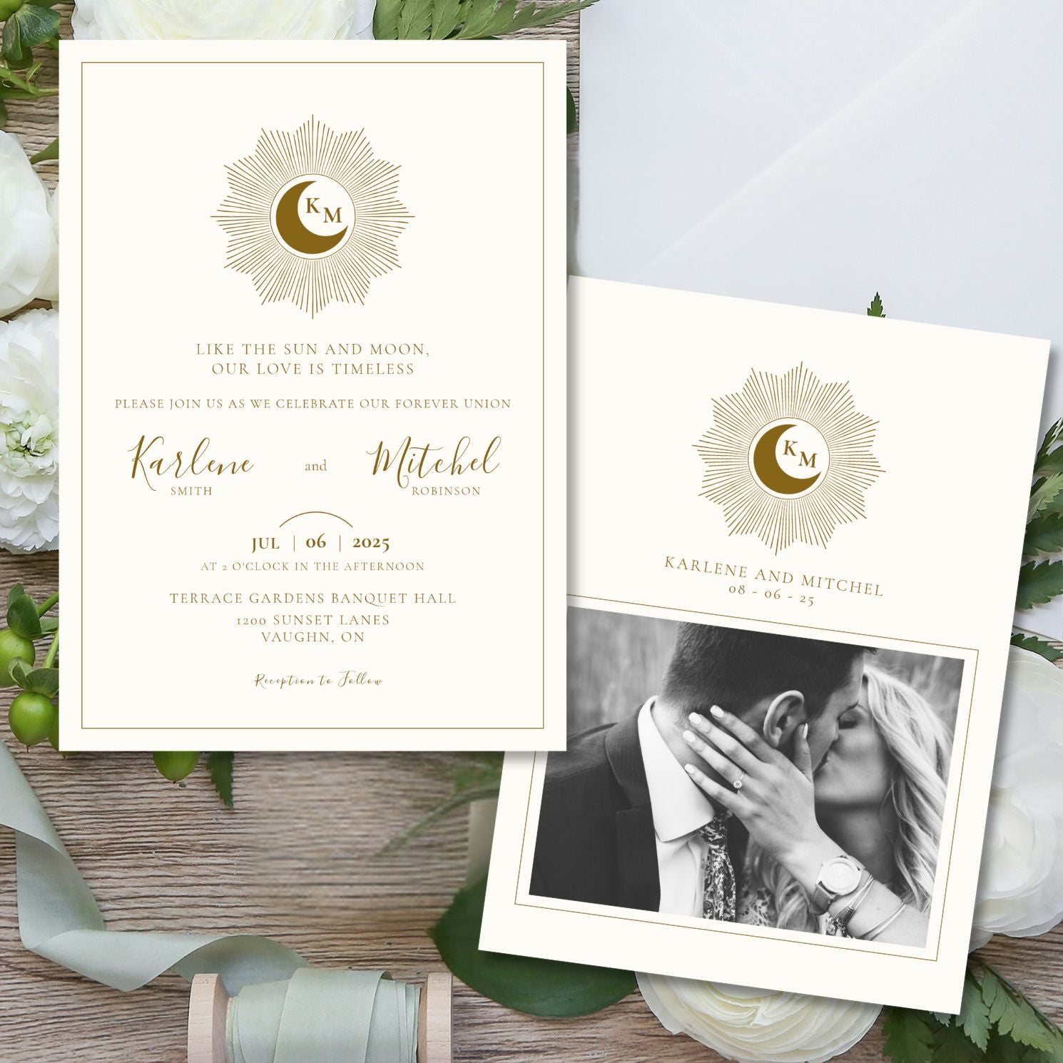 With its sleek, modern aesthetic and warm, celestial elegance, this invitation is perfect for couples who cherish a love as constant as the sun and as enduring as the moon. Ideal for celestial, bohemian, or modern wedding themes, it sets the stage for a celebration that is both meaningful and unforgettable.
