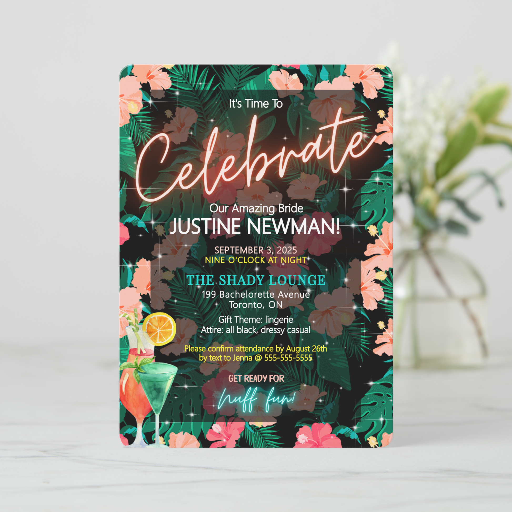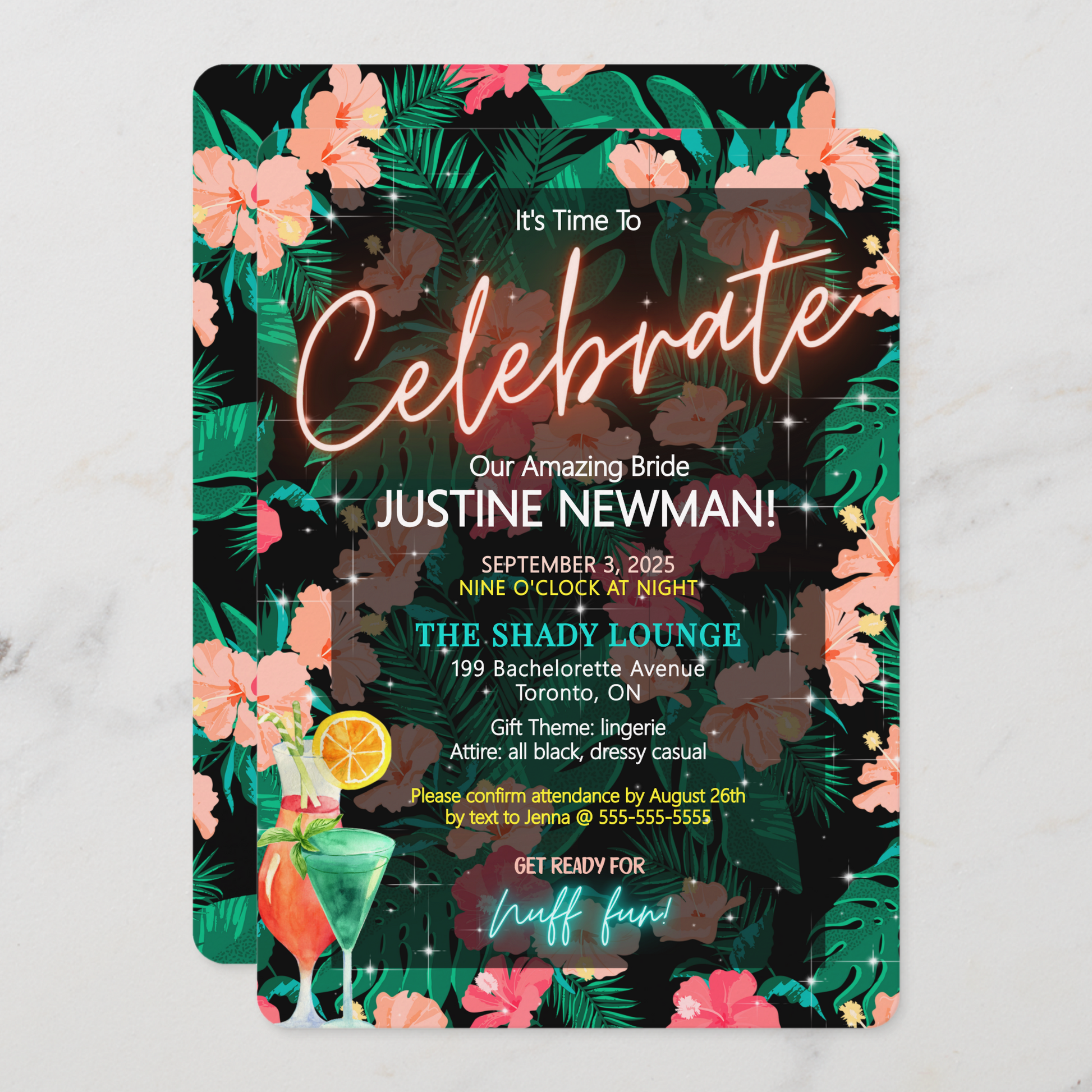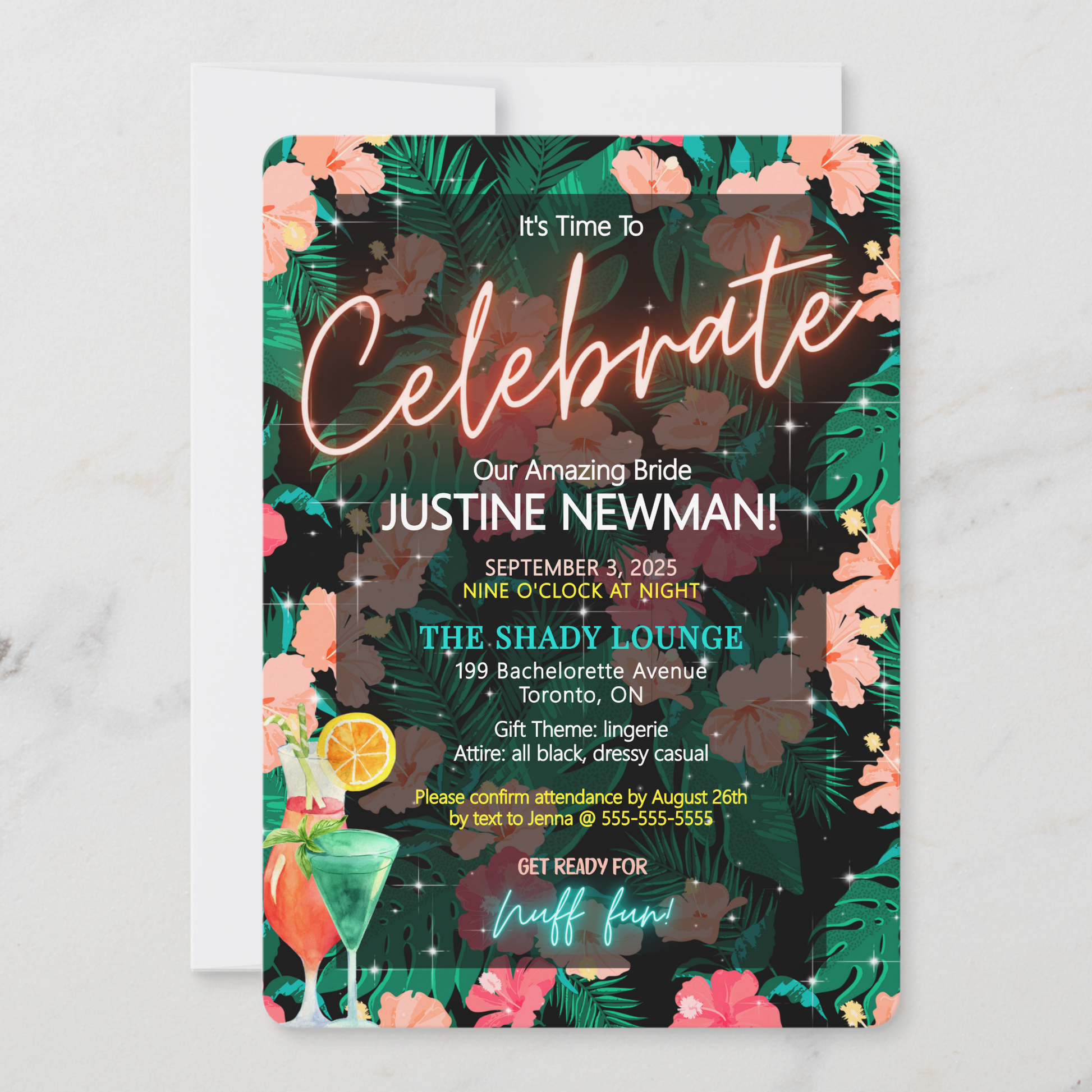Escape to paradise with this tropical-themed bachelorette party invitation, bursting with vibrant pinks, oranges, aqua blue, yellow, and lush greens. Designed to set the tone for a fun and unforgettable night, this bright and bold invite is perfect for celebrating the bride-to-be in true island style. Whether you're toasting under the palm trees or dancing the night away, this invitation brings all the tropical vibes to get the party started!