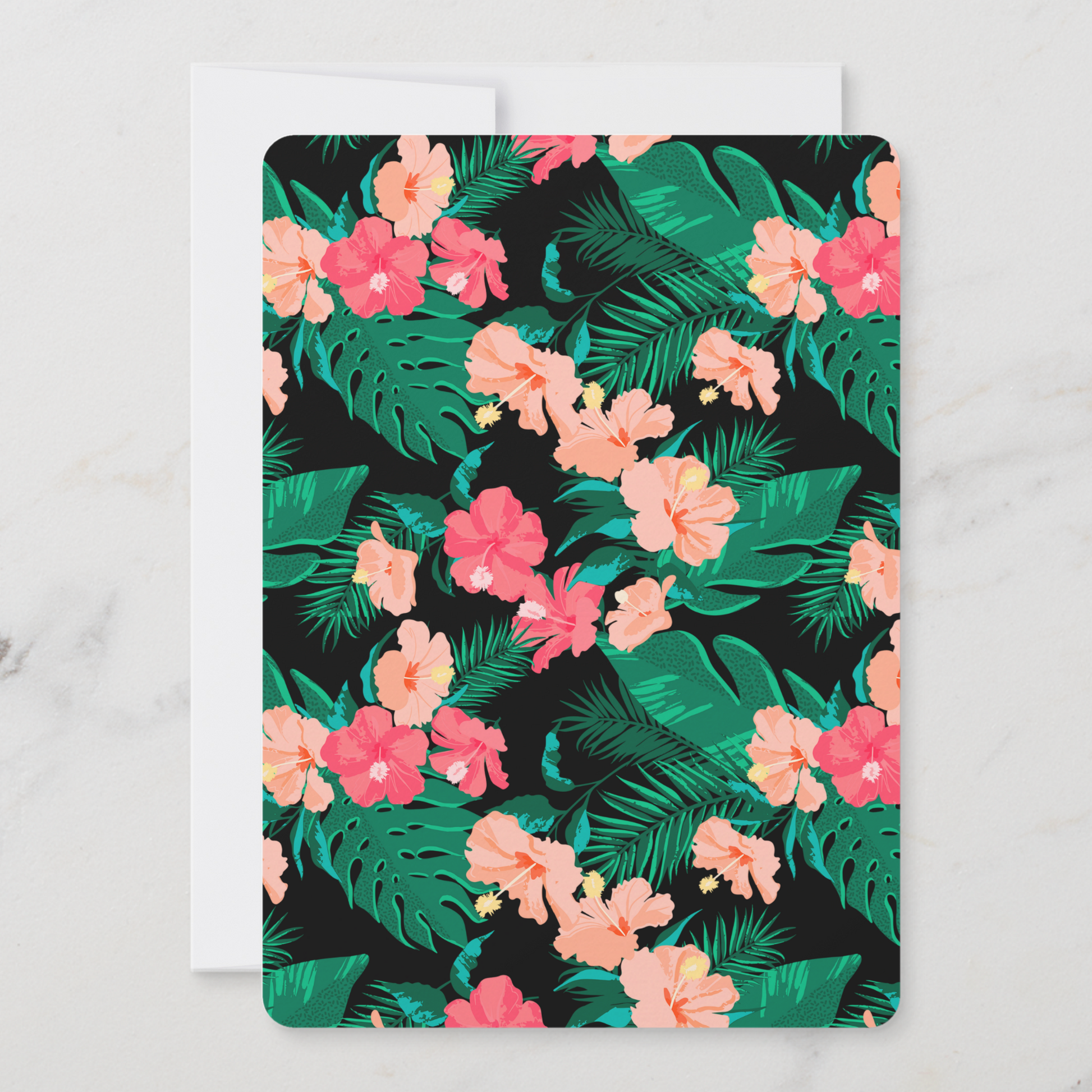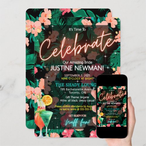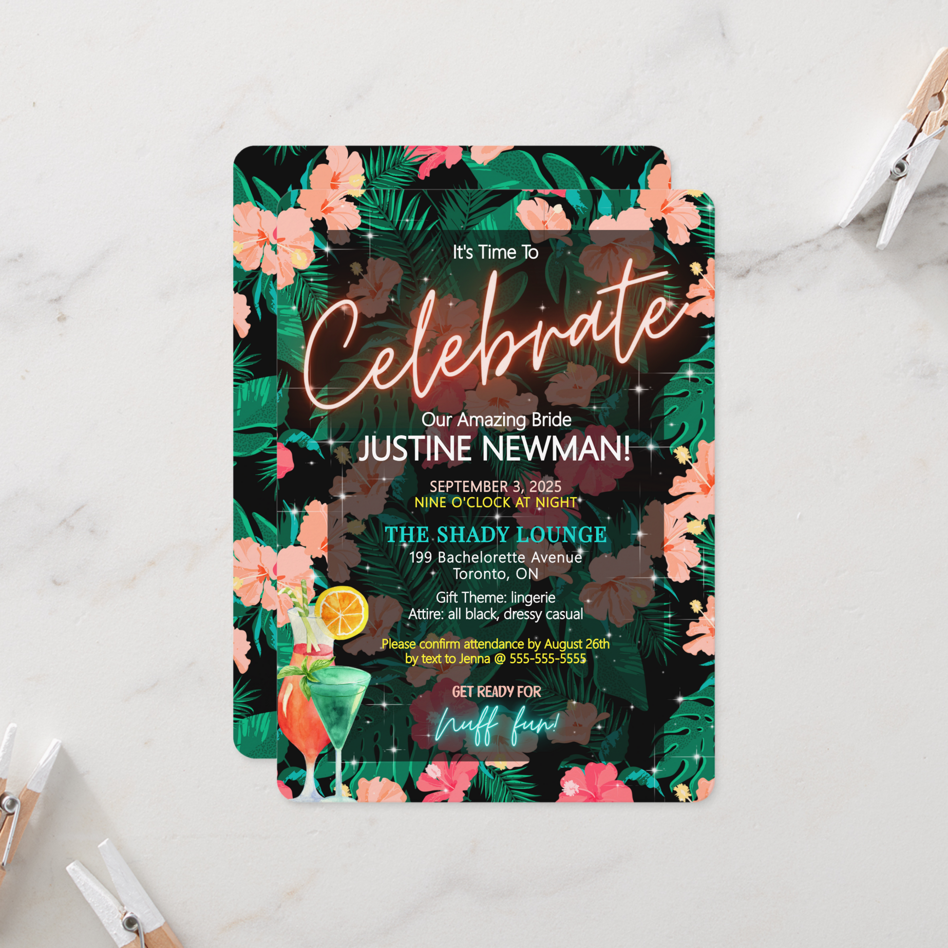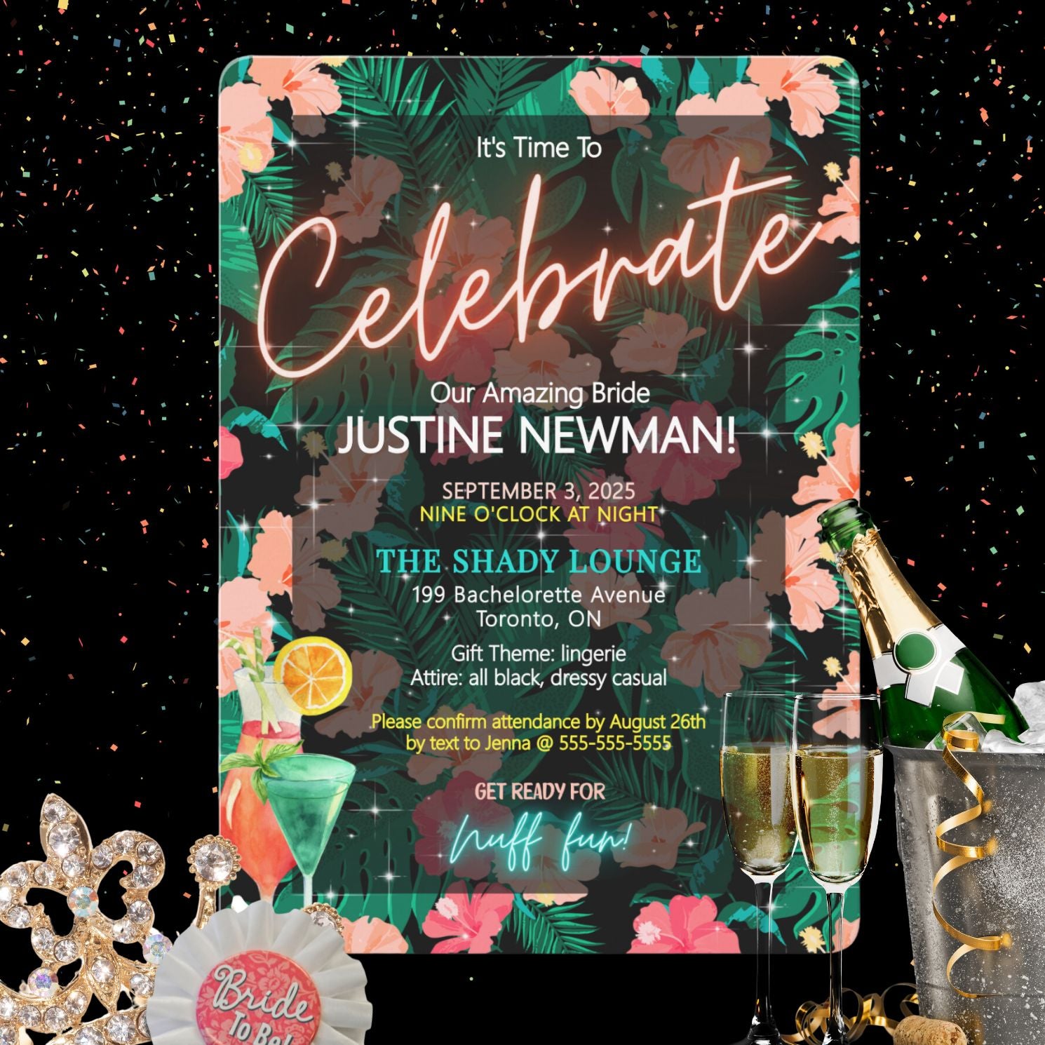 Escape to paradise with this tropical-themed bachelorette party invitation, bursting with vibrant pinks, oranges, aqua blue, yellow, and lush greens. Designed to set the tone for a fun and unforgettable night, this bright and bold invite is perfect for celebrating the bride-to-be in true island style. Whether you're toasting under the palm trees or dancing the night away, this invitation brings all the tropical vibes to get the party started!